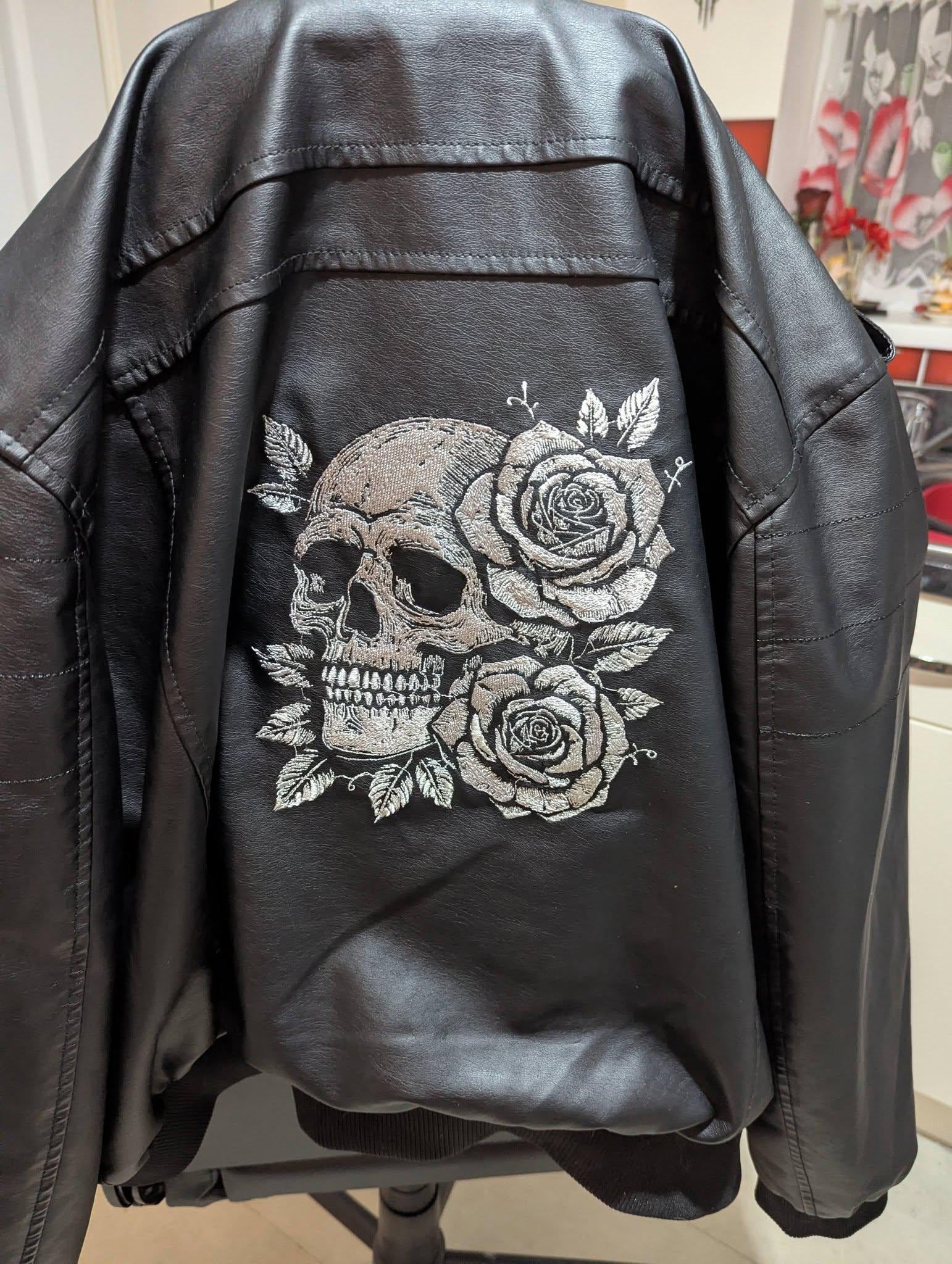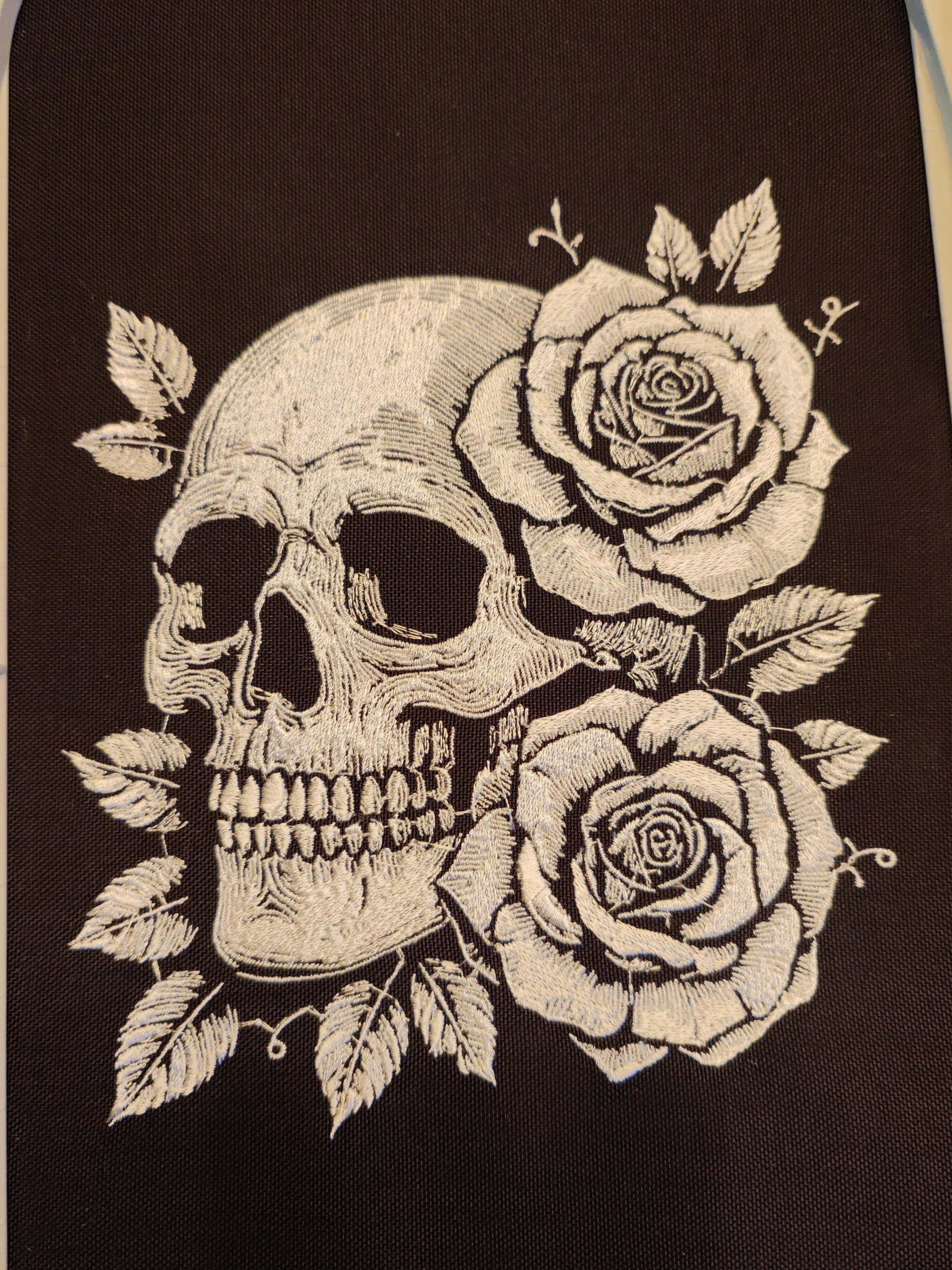 Tolles Motiv - Wirkung in weiß auf schwarzem Stoff echt klasse. Für Webstoff mit Ultra Stable Vlies sauberes Stickbild. Aber auf Sweatstoff mit 2 Lagen Ultra Stable Vlies (zum aufbügeln) und neuer Nadel (Schmetz gold) hat sich das Stickbild doch gewellt bei der hohen Stickzahl. Normal schafft mein Brother V3 saubere, ungewellte Stickbilder mit Magnetrahmen.