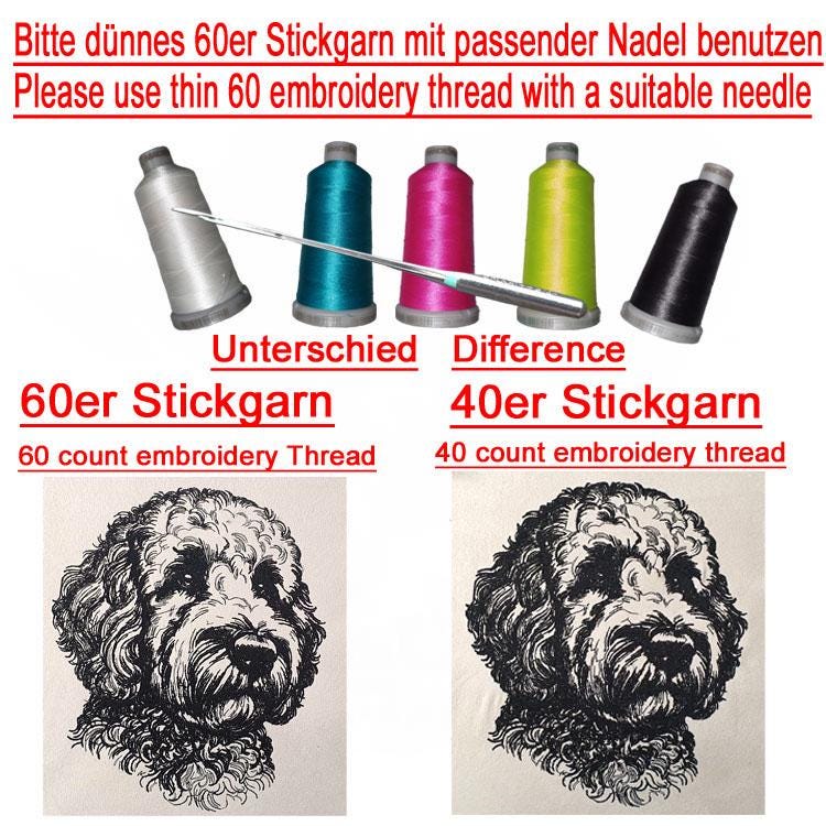 • 60er oder 40er Stickgarn (je nach Motivgröße und verwendeten Stoff dünne Stoffe, dünne Nadel, dünnes Stickgarn)
